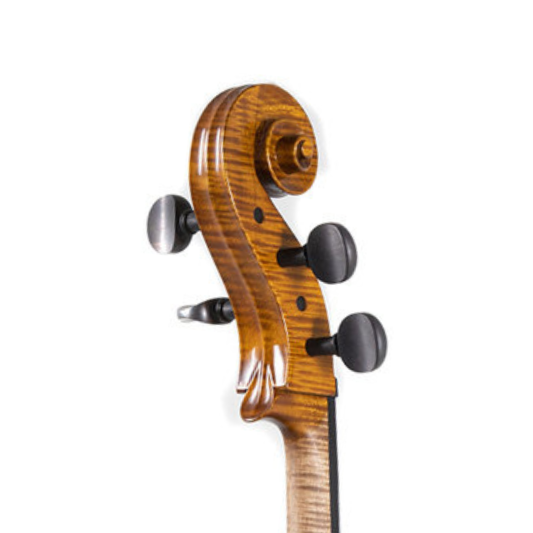 The back and ribs are crafted from beautifully flamed European maple, while the top is made from carefully selected fine-grained European spruce, chosen for its superior acoustic properties. Traditional inlaid purfling reinforces the structure while adding to the cello’s refined aesthetic. The instrument is finished with a rich amber-coloured varnish, enhancing the natural beauty of the wood and allowing the tone to mature over time.